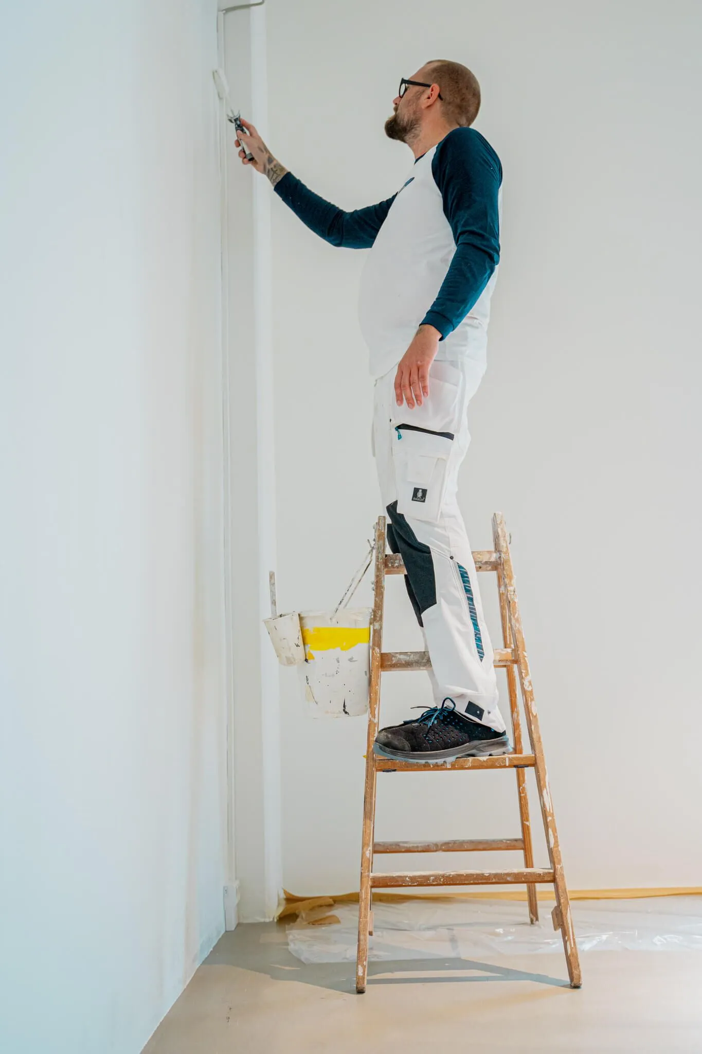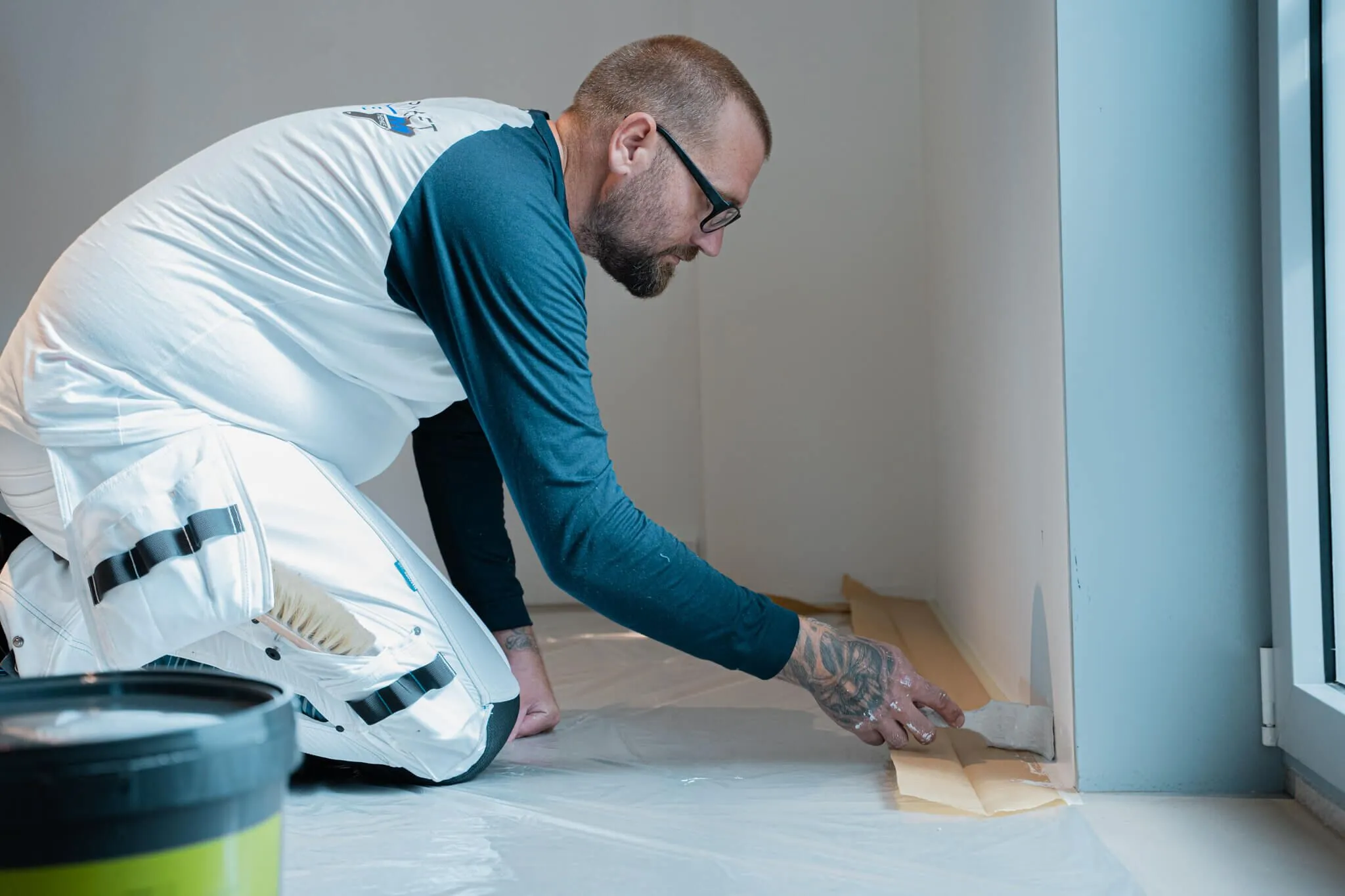 Vi starter altid med grundig forundersøgelse, hvor det kan være nødvendigt med måling af fugt, vurdering af underlag og dokumentation af reparationer. Indvendigt omfatter processen typisk afdækning, afrensning, spartling, slibning, grunder før vi maler.
